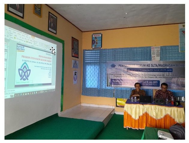 Kegiatan Penyuluhan Hukum dan Sosialisasi dilaksanakan dalam suasana penuh ceria dengan diselingi pembagian hadiah dari narasumber Dr. RASITO, S.H., M.Hum., CA, CM, CPCLE, CPA, CPArb, CPC, Ketua Program Studi Hukum Ekonomi Syariah UIN STS Jambi.