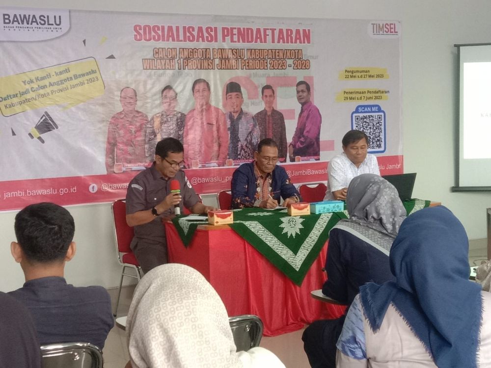 JAMBERITA.COM - Tim Seleksi (Timsel) Bawaslu kabupaten kota wilayah 1 Provinsi Jambi periode 2023-2028 menggelar sosialisasi pendaftaran di kampus Universitas Muhammadiyah Jambi, Selasa (23/5/2023).