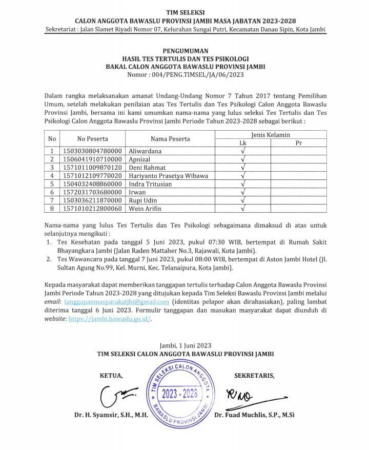 JAMBERITA.COM - Timsel Bawaslu Provinsi Jambi akhirnya mengumumkan 8 besar calon Anggota Bawaslu Provinsi Jambi. Hal ini diketahui dari pengumuman nomor 004/PENG.TIMSEL/Ja/06/2023.