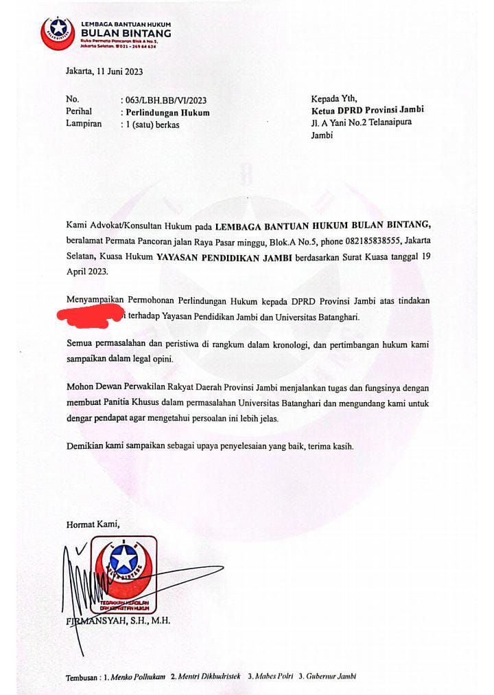 Kuasa Hukum YPJ, Firmansyah menyebutkan bahwa mereka telah memasukkan laporan yang tertuju kepada DPRD Provinsi Jambi yang tujuannya adalah meminta bantuan perlindungan hukum.