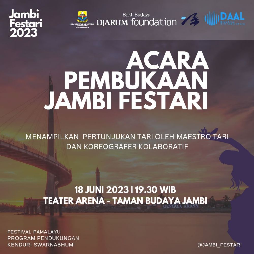 Dituturkannya, program Jambi Festari 2023 ini merupakan kerja kolaboratif antara DianArza Arts Laboratory (DAAL), Yayasan Seni Tari Indonesia (YSTI) dengan fasilitasi kegiatan dari UPTD Taman Budaya Jambi dibawah bimbingan Disbudpar Provinsi Jambi.