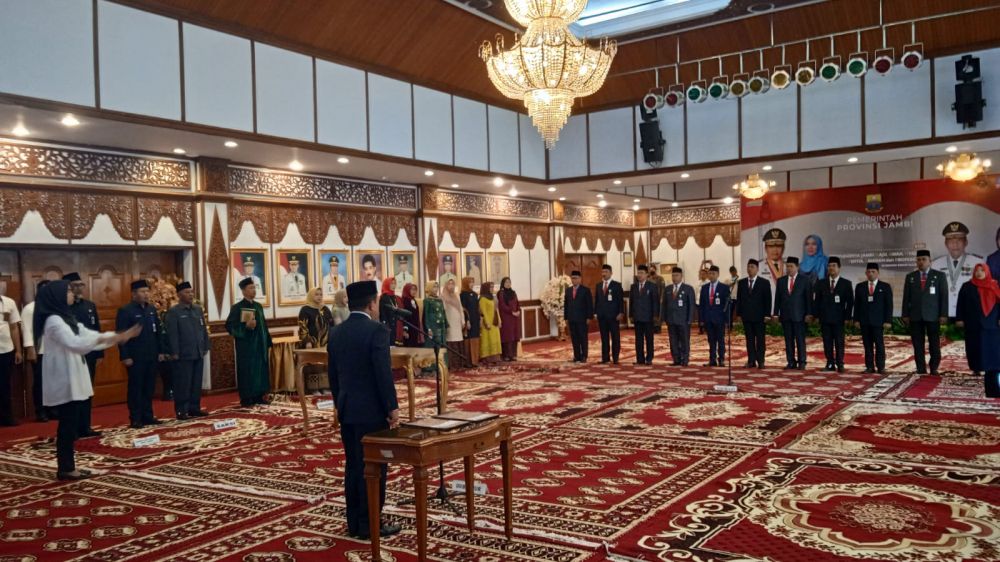 JAMBERITA.COM - Gubernur Jambi, Al Haris kembali melakukan perombakan pejabat eselon II di lingkungan Pemerintah Provinsi (Pemprov) Jambi, di Auditorium Rumah Dinas Gubernur Jambi, Rabu (21/6/2023). Mereka yang dilantik yaitu 13 pejabat, 10 di rotasi, 2 dikukuhkan dan satu orang promosi ke eselon II. Berikut nama namanya.