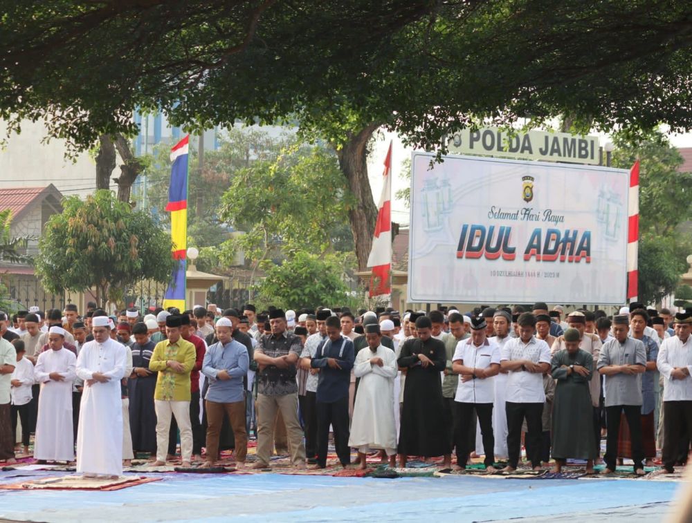 JAMBERITA.COM- Kapolda Jambi, Irjen Pol Rusdi Hartono melaksanakan salat Idul Adha 1444 Hijriah berjamaah bersama masyarakat sekitar di Lapangan depan Mapolda Jambi, Kamis (29/6/23).SAlat dipimpin H.Wahyudi yang merupakan Kepala Bidang Penyelenggaraan Haji dan Umrah (PHU) Kanwil Kementerian Agama Provinsi Jambi.