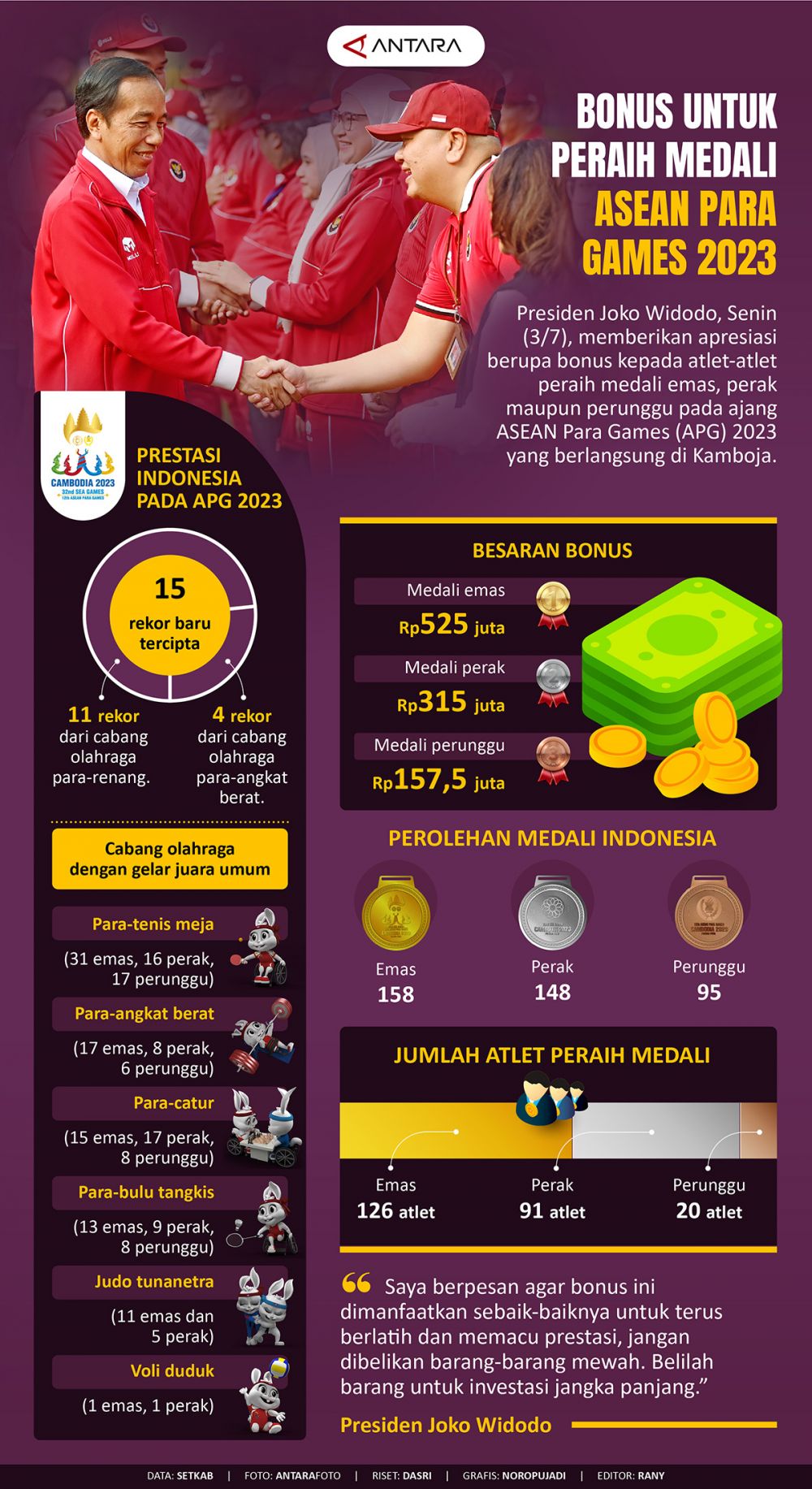 Presiden Joko Widodo, Senin (3/7), memberikan apresiasi berupa bonus kepada atlet-atlet peraih medali emas, perak maupun perunggu pada ajang ASEAN Para Games (APG) 2023 yang berlangsung di Kamboja.