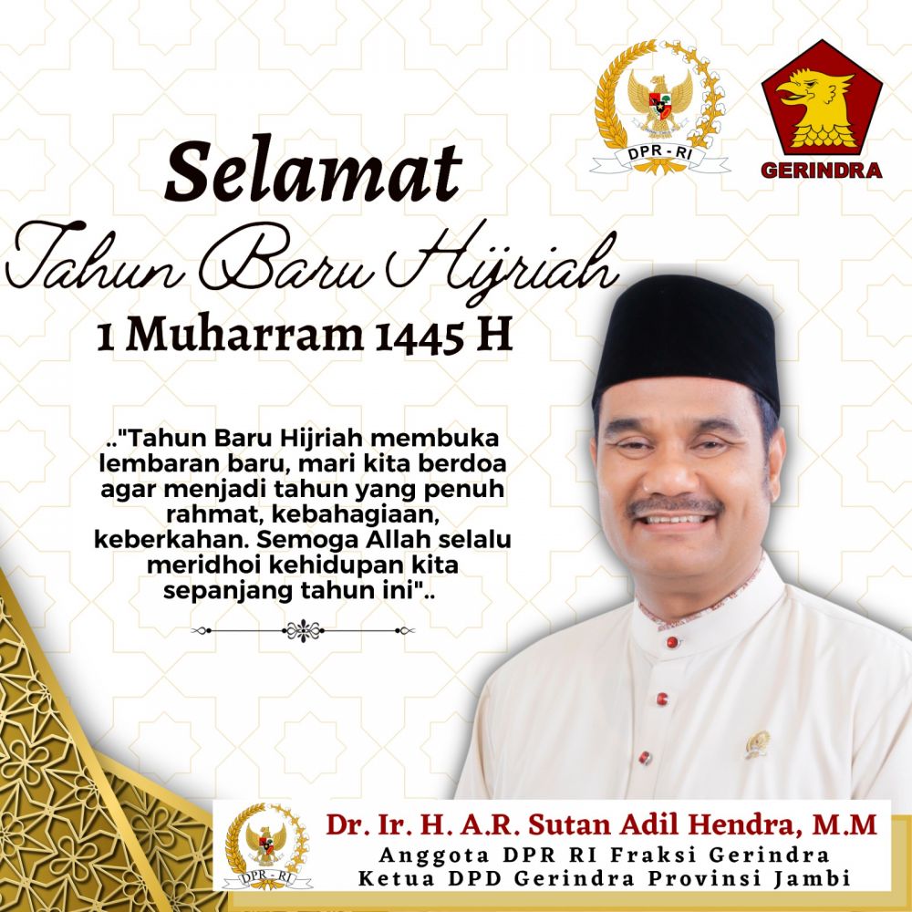 JAMBERITA.COM- Ketua DPD Partai Gerindra Provinsi Jambi yang juga Anggota DPR RI Dr. Ir. H. A.R. Sutan Adil Hendra, MM (SAH) mengucapkan selamat Tahun Baru Islam 1 Muharram 1445 Hijriyah atau 2023 Masehi.
