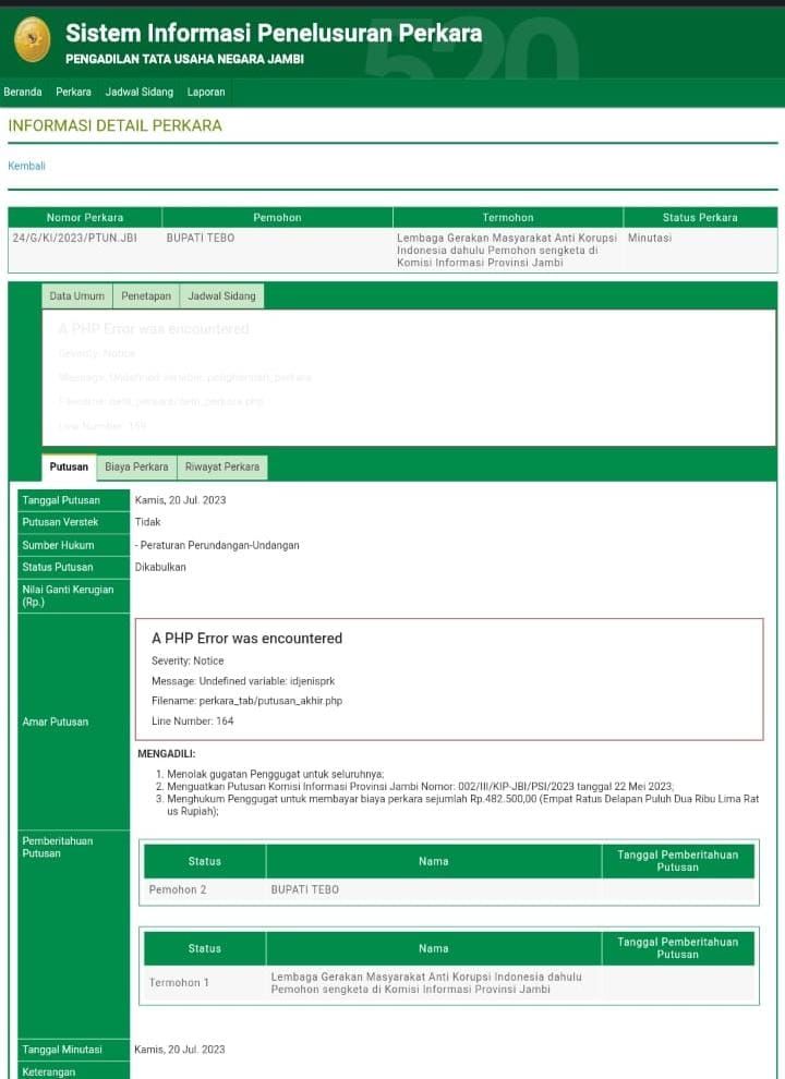 Dalam SIPP PTUN Jambi, PTUN Jambi sudah mengeluarkan putusan tertanggal Kamis 20 Juli 2023. Dimana dalam amar putusannya. Pertama, Menolak gugatan Penggugat untuk seluruhnya.