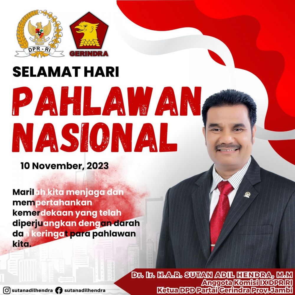 JAMBERITA.COM- Makna hari Pahlawan bagi Ketua DPD Partai Gerindra Provinsi Jambi Dr. Ir. H. A.R. Sutan Adil Hendra, MM atau SAH merupakan momentum bersejarah bagi Bangsa Indonesia. Menurut Anggota Fraksi Partai Gerindra DPR RI inilah muncul gagasan untuk menetapkan tanggal 10 November sebagai Hari Pahlawan Nasional.