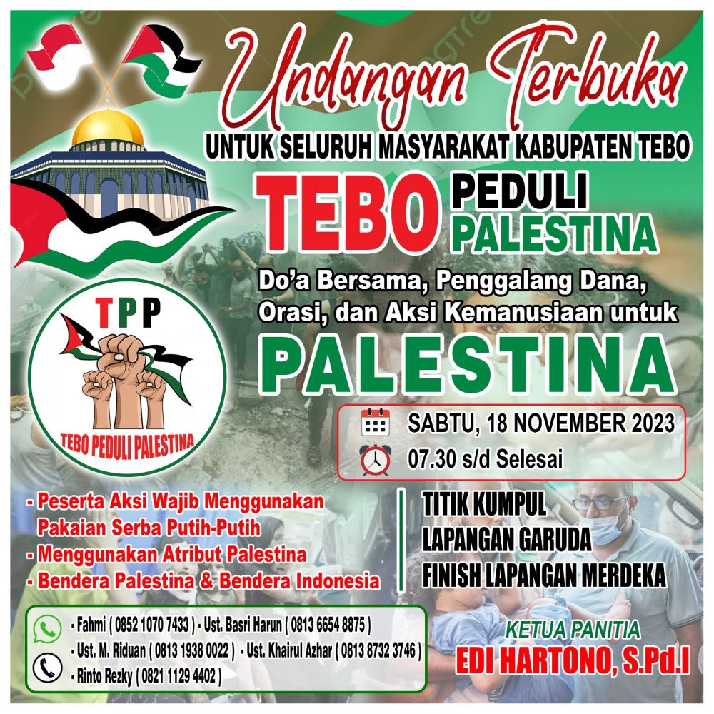 Rencananya lebih dari 20 ribu masa yang akan ikut turun dalam aksi damai, dengan tema Tebo Peduli Palestina yang akan diselenggarakan pada Sabtu, 18 November 2023 yang berlokasi di Lapangan Garuda dan Lapangan Mardeka.
