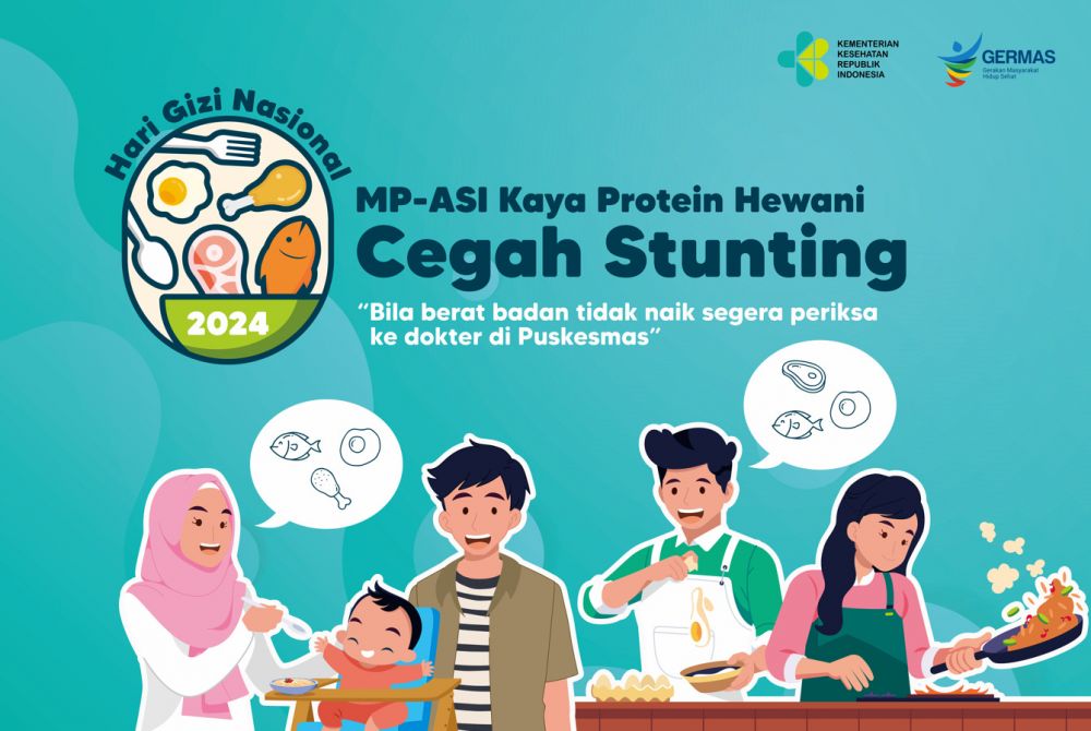 Perbaikan gizi masyarakat pada 1000 Hari Pertama Kehidupan (HPK) dengan konsumsi beragam makanan bergizi dan mengandung protein hewani setiap kali makan akan berdampak pada penurunan stunting. Bayi harus mendapatkan ASI eksklusif pada 6 bulan pertama kehidupannya melalui terlaksananya inisiasi menyusu dini (IMD) dan pemberian ASI saja yang diberikan kepada bayi kapanpun bayi membutuhkan (on demand). Setelah bayi berusia 6 bulan, pemberian ASI tetap dilanjutkan disertai dengan pemberian Makanan Pendamping ASI (MP-ASI) yang memenuhi syarat tepat waktu, adekuat dan kaya protein hewani, aman dan diberikan dengan cara yang benar. Pastikan setiap kali makan MP ASI mengandung protein hewani dan pastikan pula anak dipantau pertumbuhannya setiap bulan. Apabila berat badan anak tidak naik, segera periksa ke dokter di puskesmas. Hari Gizi Nasional ke-64 merupakan momentum yang baik untuk menggaungkan “MP-ASI Kaya Protein Hewani Cegah Stunting” dengan rangkaian kegiatan di tingkat pusat hingga ke tingkat Masyarakat serta melibatkan berbagai pihak baik pemerintah maupun swasta.