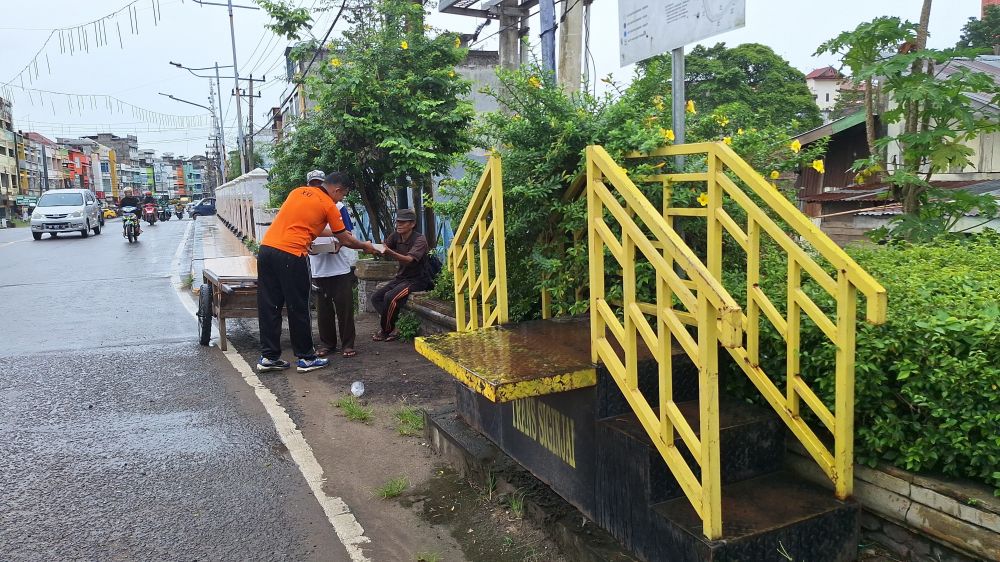 Tim pertama menuju ke seputaran pasar, tepatnya Masjid Agung Al Falah dan ke kawasan Talang Banjar. Puluhan nasi bungkus untuk makan siang dibagikan pada warga.