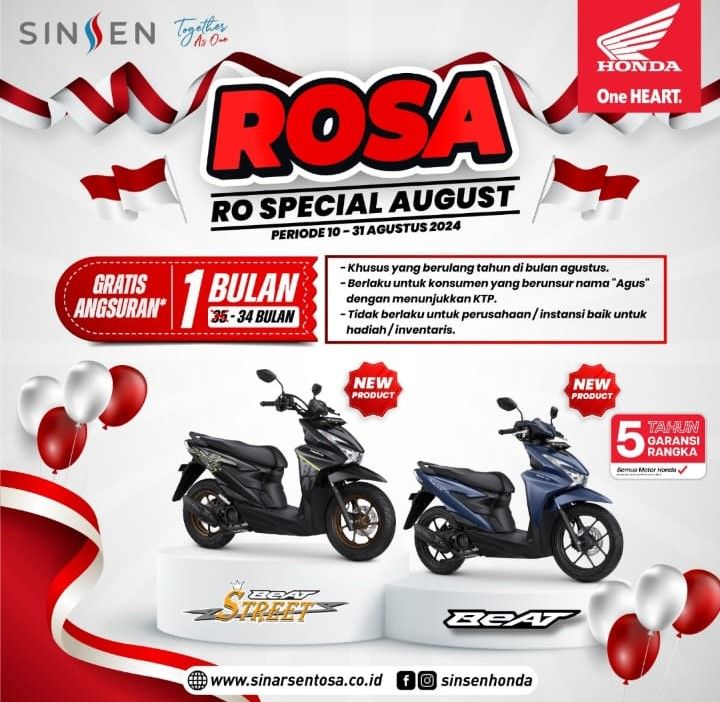 JAMBERITA.COM – Dalam rangka menyambut Hari Kemerdekaan Republik Indonesia, PT Sinar Sentosa Primatama (Sinsen) Main Dealer sepeda motor Honda bersama seluruh jaringan Dealer resminya di Provinsi Jambi memberikan program bertajuk "ROSA, RO Special August". Program ini berlaku dari tanggal 10 – 31 Agustus 2024.