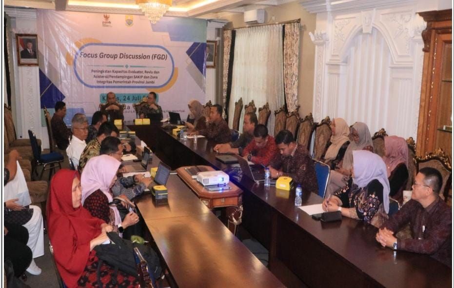 JAMBERITA.COM - Pemprov Jambi menggelar FGD Peningkatan Kapasitas Evaluator, Reviu dan Asistensi Pendampingan Sistem Akuntabiltas Kinerja Instansi Pemerintah (SAKIP) dan Zona Integritas di Badan Penghubung Daerah, Jalarta 23-25 Juli 2025.