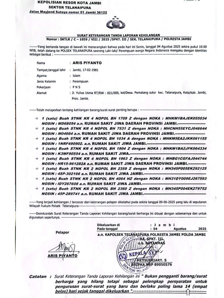 Setelah melalui proses dan verifikasi laporan kehilangan, pihak RSJD mengumumkan atas kehilangan dokumen tersebut dengan nomor : SKTLK/C1060/VIII/2025/SPKT.III/SEK.TELANAIPURA/POLRESTA JAMBI.