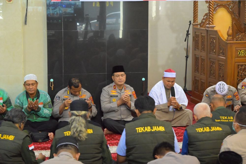 “ Pada kesempatan ini kita berkumpul untuk berdoa memohon petunjuk dan kekuatan dari Allah agar keadaan kembali aman dan tenang. Yang kita lakukan ini lillahita’ala, semata-mata demi menjaga negeri ini. Mari kita tegak lurus dengan niat karena Allah SWT,” ujar Wakapolda Jambi.
