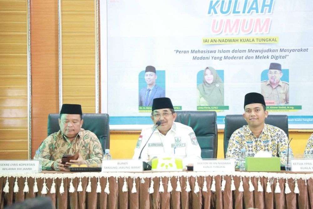 JAMBERITA.COM- Bupati Tanjung Jabung Barat, Drs. H. Anwar Sadat, M.Ag., menghadiri sekaligus menjadi narasumber dalam Kuliah Umum Mahasiswa Institut Agama Islam (IAI) An-Nadwah Kuala Tungkal dengan tema “Mewujudkan Masyarakat Madani yang Moderat dan Melek Digital.” Acara berlangsung di Aula Kampus IAI An-Nadwah Kuala Tungkal, Rabu (3/9/25).