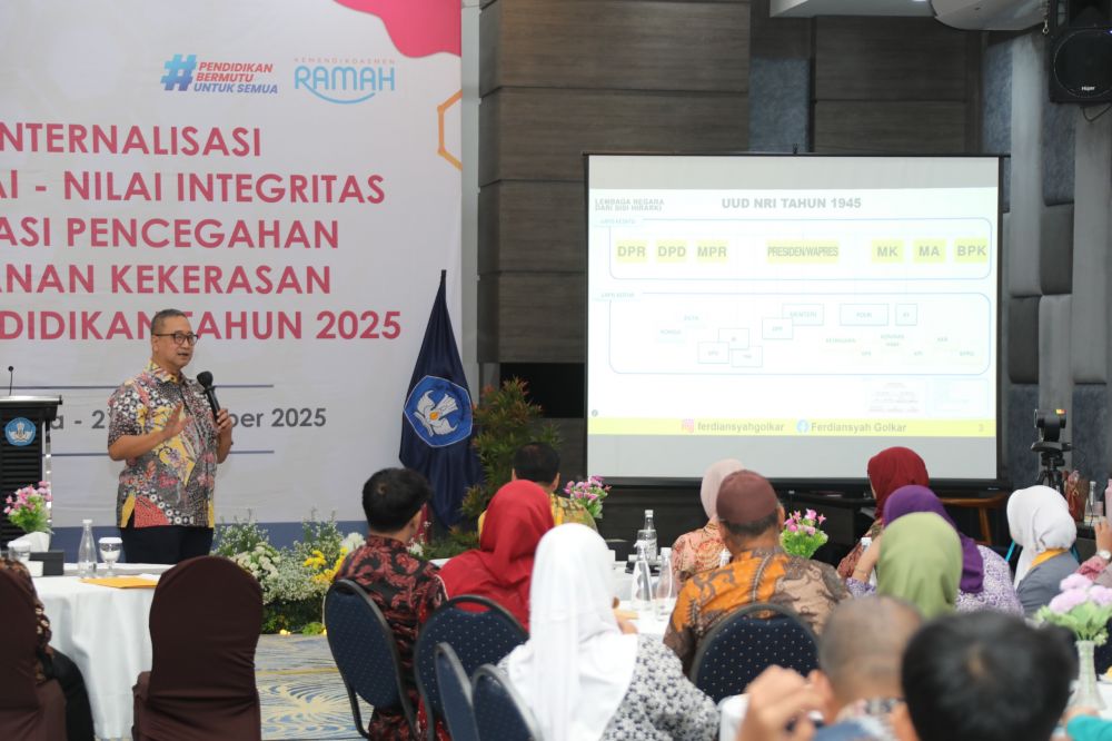 JAMBERITA.COM - Lebih dari seribu guru dan murid dari 25 provinsi mengikuti kegiatan Internalisasi Penanaman Nilai-Nilai Integritas serta Sosialisasi Pencegahan dan Penanganan Kekerasan pada Satuan Pendidikan Tahun 2025 yang digelar Kementerian Pendidikan Dasar dan Menengah (Kemendikdasmen) melalui Inspektorat Jenderal (Itjen) bersama Komisi X DPR RI dan Dharma Wanita Persatuan (DWP) Kemendikdasmen. Sebanyak 90 peserta hadir langsung di Tasikmalaya, sementara lainnya bergabung secara daring.