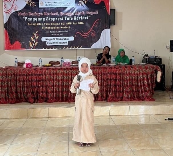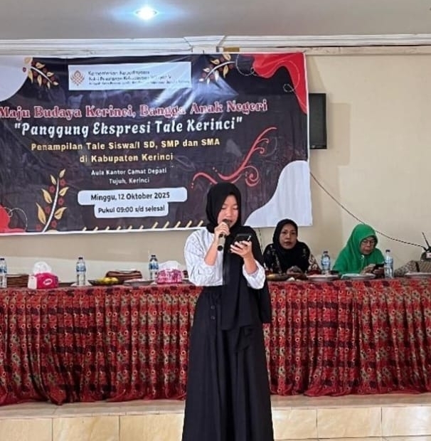 JAMBERITA.COM- Dalam bentuk upaya pelestarian budaya Kerinci khususnya tradisi lisan Kerinci, Astuni Rahayu, selaku peneriman Bantuan Pemerintah Fasilitasi Pemajuan Kebudayaan Tahun 2025 dari Balai Pelestarian Budaya Wilayah V, Kementerian Budaya RI, mengadakan kegiatan dengan tema Maju Budaya Kerinci, Bangun Anak Negeri: Pelatihan dan Panggung Eskpresi Tradisi Lisan Kerinci. Rangkaian kegiatan ini diadakan sejak tanggal 3 - 12 Oktober 2025.