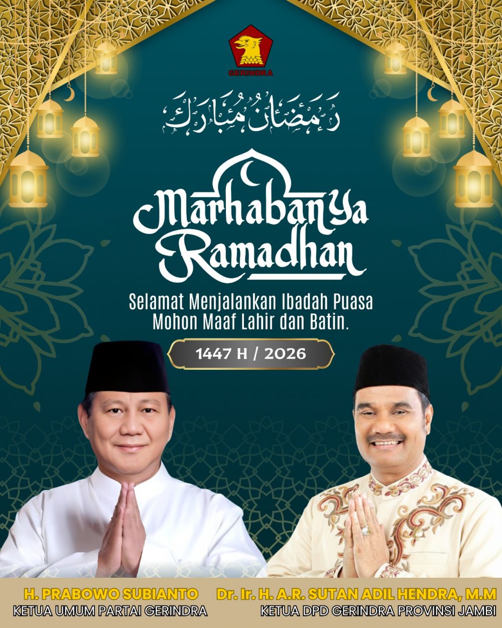 JAMBERITA.COM— Menyambut datangnya bulan suci Ramadhan, Ketua DPD Partai Gerindra Provinsi Jambi, Sutan Adil Hendra, menyampaikan ucapan Marhaban Ya Ramadhan kepada seluruh masyarakat Jambi dan umat Muslim pada umumnya.