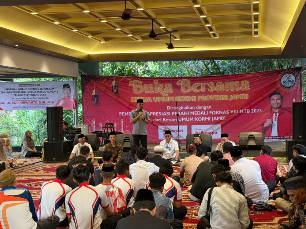 JAMBERITA.COM– Ketua Komite Olahraga Masyarakat Indonesia (KORMI) Provinsi Jambi, Edi Purwanto, memberikan apresiasi nyata bagi para pegiat olahraga yang sukses mengharumkan nama daerah di kancah nasional. Dalam suasana hangat buka puasa bersama keluarga besar KORMI Jambi (28/2/2026), Edi menyerahkan bonus uang tunai kepada para peraih medali Festival Olahraga Masyarakat Nasional (FORNAS) VIII di Nusa Tenggara Barat (NTB).