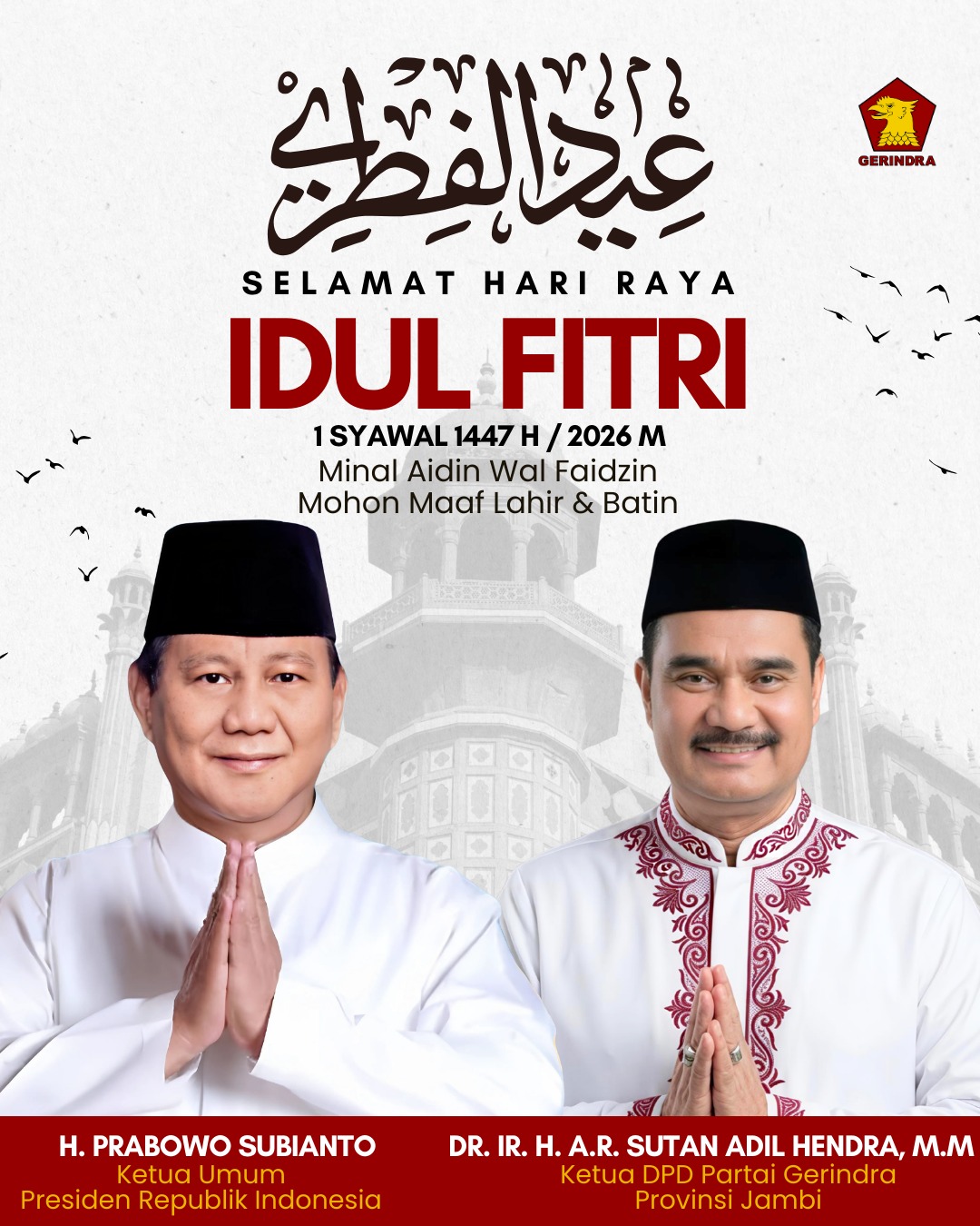 JAMBERITA.COM– Ketua DPD Partai Gerindra Provinsi Jambi, Dr. Ir. H. A.R. Sutan Adil Hendra, MM (SAH), menyampaikan ucapan selamat Hari Raya Idulfitri 1 Syawal 1447 Hijriah kepada seluruh umat Islam, khususnya di Provinsi Jambi. Pesan ini disampaikan dengan nuansa religius yang kental, menekankan makna kemenangan spiritual dan kebersamaan.