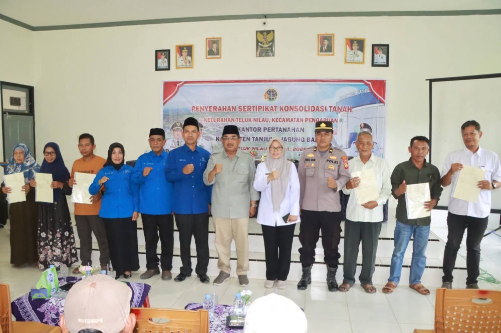 JAMBERITA.COM– Bupati Tanjung Jabung Barat, Drs. H. Anwar Sadat, M.Ag., menyerahkan sebanyak 71 sertifikat tanah hasil konsolidasi kepada masyarakat Kelurahan Teluk Nilau, Kecamatan Pengabuan, dalam acara yang digelar di Aula Kantor Camat Pengabuan, Rabu (08/04/26).