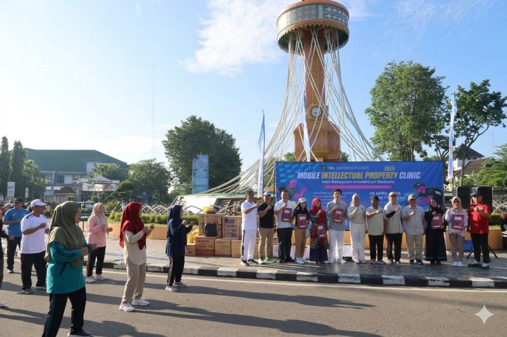 JAMBERITA.COM - Ratusan warga Kota Jambi memadati kawasan Car Free Day (CFD) Tugu Keris Siginjai untuk mengikuti senam massal dalam rangka memperingati Hari Kekayaan Intelektual Sedunia (World Intellectual Property Day) Tahun 2026, Minggu (26/04/2026). Kegiatan ini menjadi puncak kemeriahan edukasi hukum yang dibalut dengan nuansa olahraga dan hiburan rakyat.