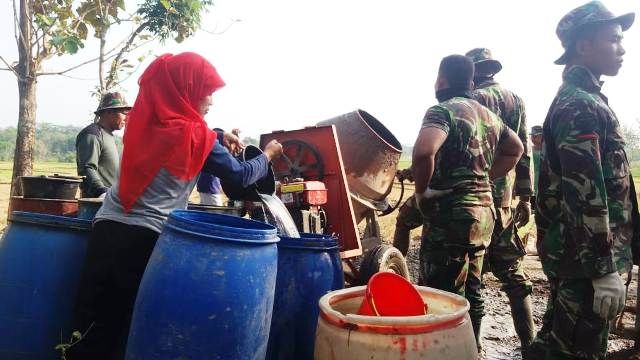 Ibu Endah (40) dengan berkerudung merah begitu adil dan cekatan dalam mengambil air di bak bak/drum untuk diserahkan kepada satgas. Selanjutnya dimasukan ke dalam molen sebagai campuran adonan.