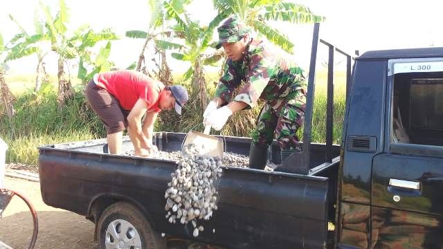 SALATIGA - Kebut sasaran pengecoran jalan yang menghubungan dusun Gedong dan dusun Krajan desa Bonomerto kecamatan Suruh kabupaten Semarang, para anggota satgas TNI Manunggal Membangun Desa (TMMD) Reg-102 Kodim 0714/Salatiga menggunakan kendaraan bak terbuka (Pick-up) untuk melangsir batu split kelokasi pengecoran jalan bersama masyarakat dan satgas lainnya.
