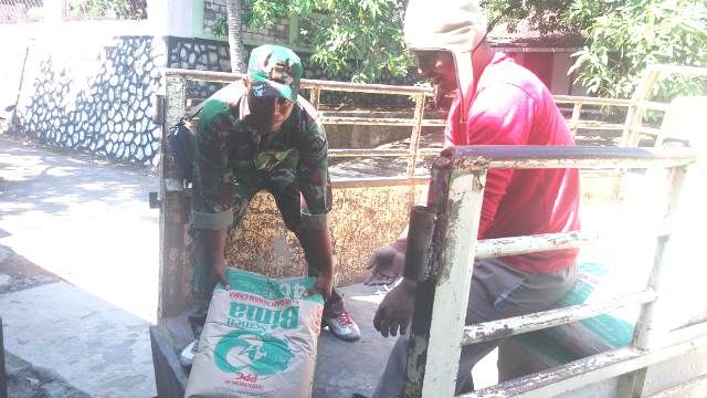 Serda Jumadi bersama dengan warga masyarakat menaikkan semen ke mobil truk yang diambilnya dari gudang satuan tugas (satgas) TNI Manunggal Membangun Desa (TMMD) yang terletak di dusun Karangdawung desa Bonomerto guna untuk di dropping ke lokasi-lokasi TMMD Reguler 102 Kodim 0714/Salatiga di desa Bonomerto.