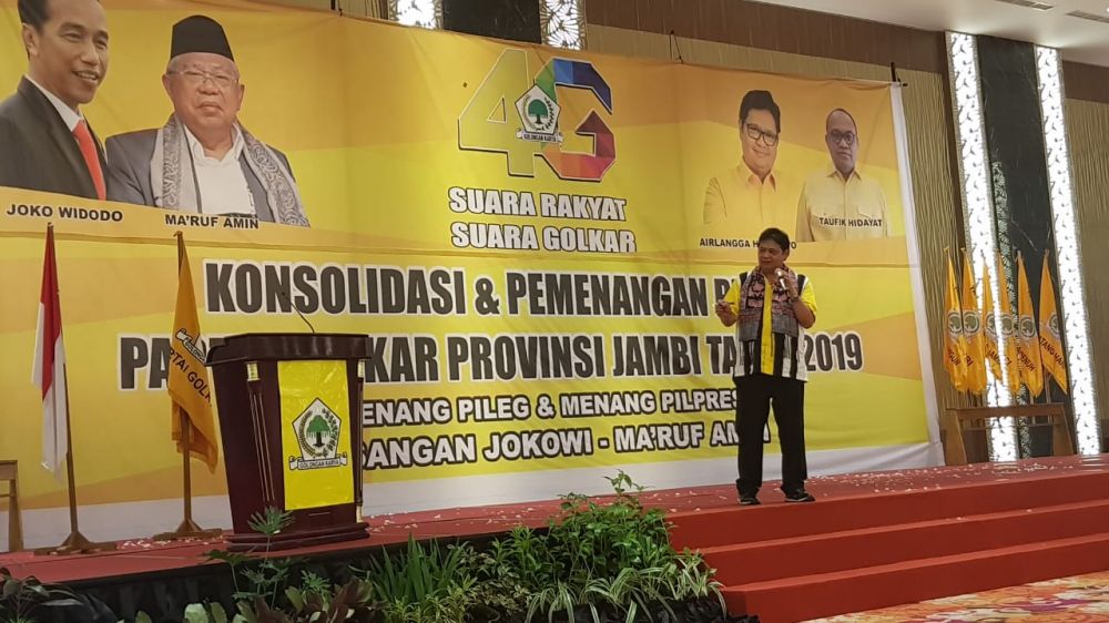 JAMBERITA.COM - Ketua Umum DPP Golkar, Airlangga Hartanto menyatakan Golkar all out memenangkan Jokowi - Ma'ruf Amin. Karena itu semua kader di Jambi harus bergerak.
