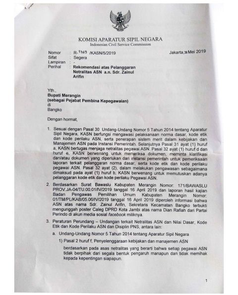 JAMBERITA.COM - Bawaslu Merangin menerima jawaban dari Komisi Aparatur Sipil Negara (KASN) terhadap rekomendasi yang disampaikan pada 16 April terhadap pelanggaran ketidaknetralan ASN Merangin. ASN tersebut adalah Sekretaris Kecamatan Bangko, Zainul Arifin.