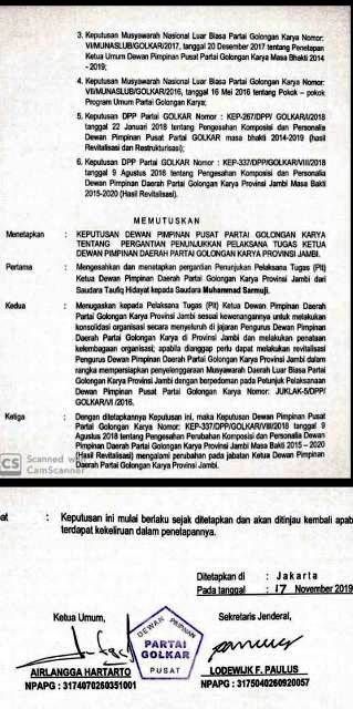 JAMBERITA.COM- Ketua PLt DPD Golkar Provinsi Jambi M Taufik diganti. DPP Golkar menunjuk Muhammad Sarmuji untuk melaksanakan tugas menjelang terbentuknya ketua defenitif. Ini tertuang dalam SK nomor Kep 396/DPP/Golkar/XI/2019.