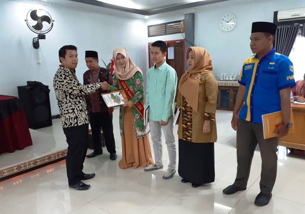 Korsek Bawaslu Sarolangun menyerahkan buku potret pengawasan pemilu di sarolangun kepada Upik Sarolangun (Putri Indonesia Sarolangun) Tahun 2019.