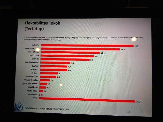 Yang mengejutkan hasil survei dari lembagai survei ini, Walikota Jambi Syarif Fasha menyalip elektabilitas Mantan Gubernur Jambi H Hasan Basri Agus (HBA).