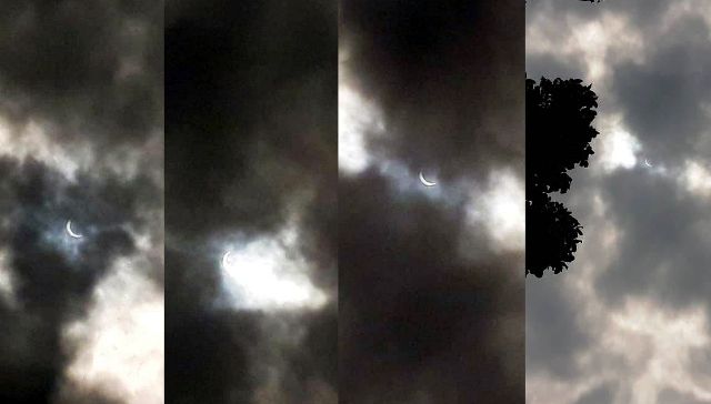 Berdasarkan pantauan Jamberita.com, gerhana terlihat sekitar pukul 12.10 hingga beberapa menit. Matahari yang berada tepat di atas kepala terlihat seperti bulan sabit. Meski langit berawan, gerhana masih terlihat jelas.