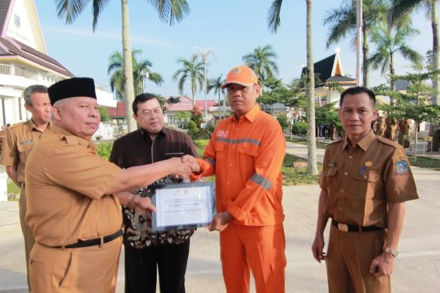 Usai upacar, Buati didampingi Wakil Bupati dan Sekda serahkan bantuan rumah dinas layak huni bagi tenaga honorer petugas kebersihan Dinas Lingkungan Hidup dari Petrochina. Bantuan yang diterima atas nama atas nama Marjoansyah tersebut senilai Rp 28 juta.