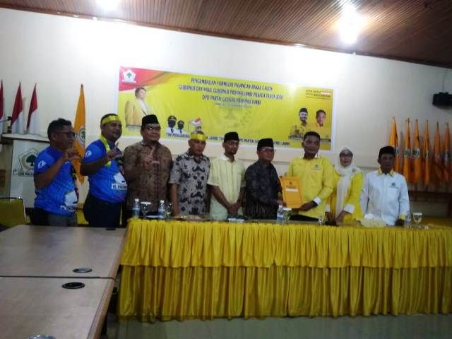 JAMBERITA.COM- Tidak berselang dengan Walikota Jambi kembalikan formulir, Gubernur Jambi Fachrori Umar juga kembalikan formulir ke DPD I Golkar Provinsi Jambi, Kamis (13/2/2020). Petahana ini sendiri dikawal tim pendukung yang terlihat masih muda-muda.