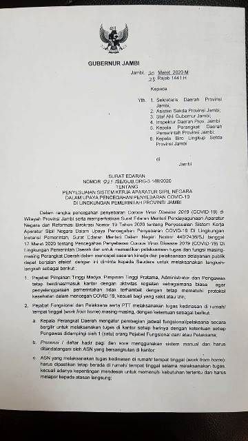 Surat edaran Gubernur Jambi ini memedomani Surat Edaran Menteri Pendayagunaan Aparatur Negara dan Reformasi Birokrasi Nomor 19 Tahun 2020 tentang Penyesuaian Sistem Kerja Aparatur Sipil Negara Dalam Upaya Pencegahan Penyebaran COVID-19 di Lingkungan Instansi Pemerintah, dan Surat Edaran Menteri Dalam Negeri Nomor 440/2436/SJ tanggal 17 Maret 2020 tentang tentang Pencegahan Penyebaran Corona Virus Disease 2019 (COVID-19) di Lingkungan Permentan Pemerintah Daerah.