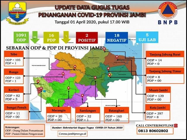 Berikut update data Gugus Tugas Penanganan Virua Corona di Provinsi Jambi, jumlah Orang Dalam Pemantauan (ODP) 1.091, Pasien Dalam Pengawasan (PDP) 16 orang, sedang dalam uji lab 5 orang, Pasien Negatif 18 orang dan Pasien Positif 2 orang.