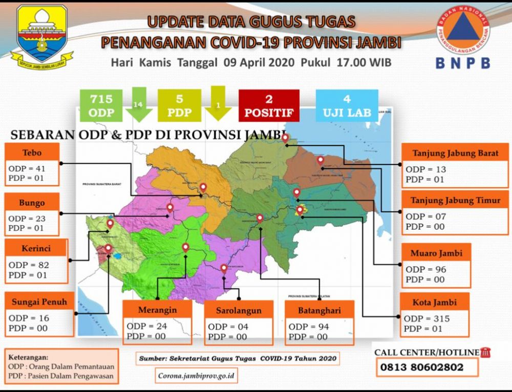 Berikut data persebaran kasus Virus Corona di provinsi Jambi. Kabupaten Tebo 41 ODP dan 1 PDP, Bungo 23 ODP dan 1 PDP, Kerinci 82 ODP dan 1 PDP, Sungai Penuh 16 ODP, Merangin 24 ODP, Sarolangun 4 ODP, Batanghari 94 ODP, Tanjung Jabung Barat 13 ODP dan 1 PDP, Tanjung Jabung Timur 7 ODP, Muaro Jambi 96 ODP serta Kota Jambi 315 ODP dan 1 PDP. (sap)