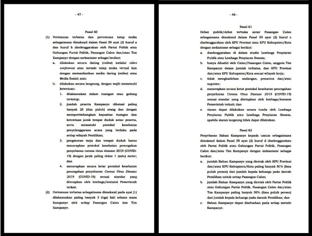 Untuk pertemuan terbatas sendiri hanya dibatasi selama 3 kali dengan minimal 20 orang yang boleh ikut dalam pertemuan tersebut selama batas kampanye yang diatur selama 71 hari. Untuk debat sendiri tidak akan ada lagi masuk para suporter, dan tim kampanye sendiri dibatasi. Peraturan pelaksanaan kampanye sendiri yang secara langsung tetap mengedepankan protokol kesehatan.