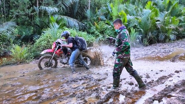 Nampak Dandim dan rombongan turut saling bahu membahu untuk saling membantu mendorong kendaraan motor jenis trail di dalam genangan lumpur / tanah yang merupakan akses jalan untuk menuju sasaran.