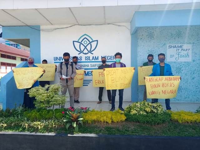 JAMBERITA.COM- Forum Mahasiswa Jambi gelar aksi damai, Senin (6/7/2020) mengenai kegaduhan yang terjadi didalam tubuh Kementerian Badan Usaha Milik negara (BUMN). Mahasiswa tersebut setidaknya menyoroti beberapa hal. Berikut ini adalah masalah serta tuntutan yang disampaikan.