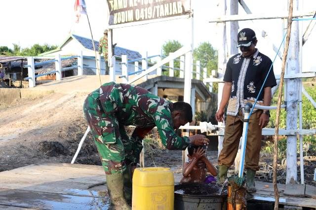 JAMBERITA.COM- Satuan tugas (Satgas) Tentara Manunggal Membangun Desa (TMMD) ke 108 Kodim 0419/Tanjab membangun sumur bor untuk membantu penyediaan air bersih bagi warga Desa Labuhan Pering, Kecamatan Sadu, Kabupaten Tanjab Timur.