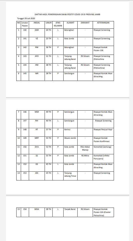 Juru bicara tim gugus tugas penanganan Covid-19 provinsi Jambi Johansyah mengatakan bahwa pasien tersebut berasal tujuh kabupaten yang berbeda, yaitu kabupaten Batanghari, Kota Jambi, Tanjung Jabung Barat, Sarolangun, Kerinci, Muaro Jambi dan Tanjung Jabung Timur.