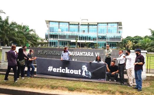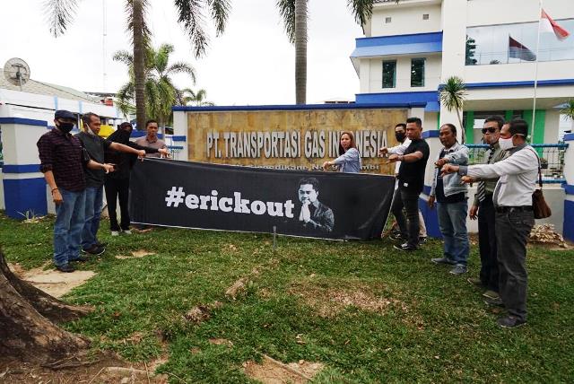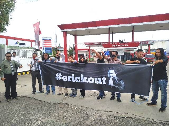 Dalam aksinya, sejumlah aktivis dari berbagai elemen ini terlihat memasang spanduk bertuliskan Erickout di sejumlah instansi Badan Usaha Milik Negara seperti Bank Mandiri, Jasa Raharja, PLN, Telkomsel, Pertamina, Jiwa Sraya. BTN, BNI hingga PTPN VI.