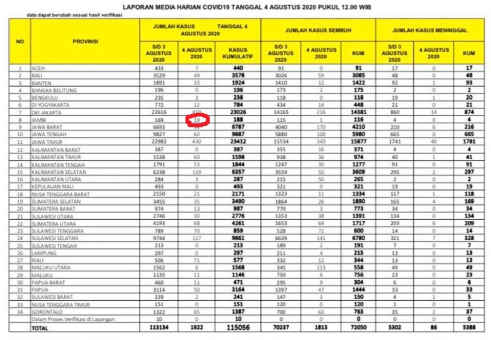 JAMBERITA.COM- Sebulan masa relaksasi, kasus Covid 19 di Jambi melonjak tajam. Bahkan per 4 Agustus 2020, ada tambahan 19 kasus baru. Sehingga total menjadi 188 orang.
