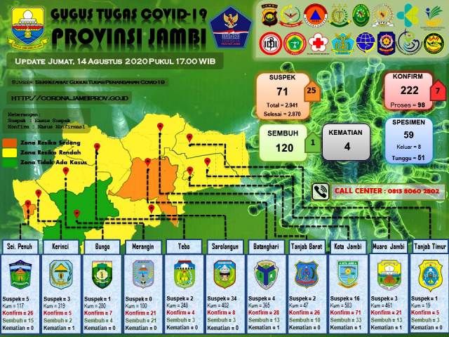 Hingga saat ini total keseluruhan pasien positif di Provinsi Jambi sebanyak 222 orang, 4 pasien meninggal dunia, 120 pasien dinyatakan sembuh dan 98 orang sedang dalam perawatan di rumah sakit. (sap)