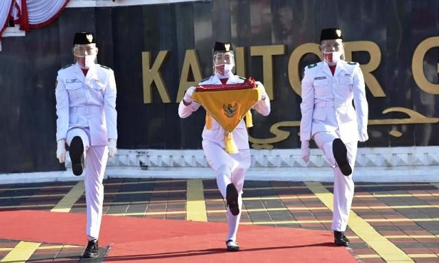 Untuk 3 orang Paskibraka pertama yang bertugas dalam mengibarkan bendera Merah Putih selain menggunakan masker juga menggunakan alat pelindung wajah.