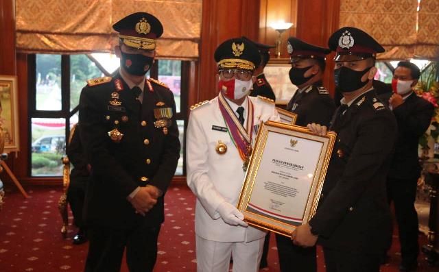 JAMBERITA.COM - Kapolda Jambi, Irjen Pol Firman Santyabudi mendampingi Gubernur Jambi, H Fahcrori Umar menyerahkan penghargaan kepada tiga personel Polres Muaro Jambi.